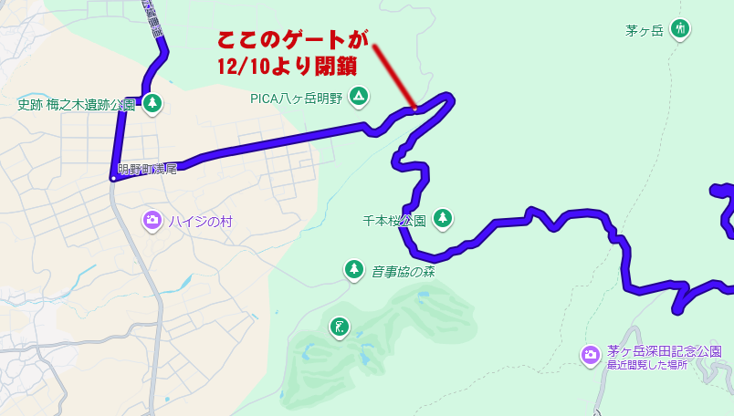 県営林道前山大明神線は、昨日の12/10から4月下旬まで通行止めとのこと。