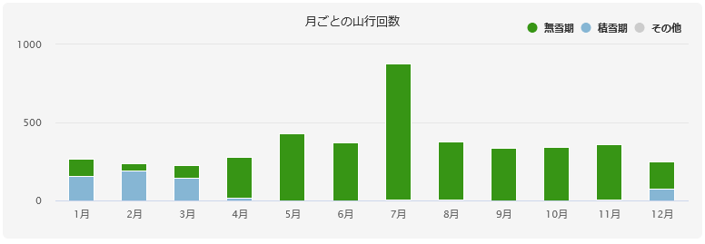 ヤマレコの山行数を見てみると、飯盛山は7月は870回と突出していますが、他の月も数百回レベル。